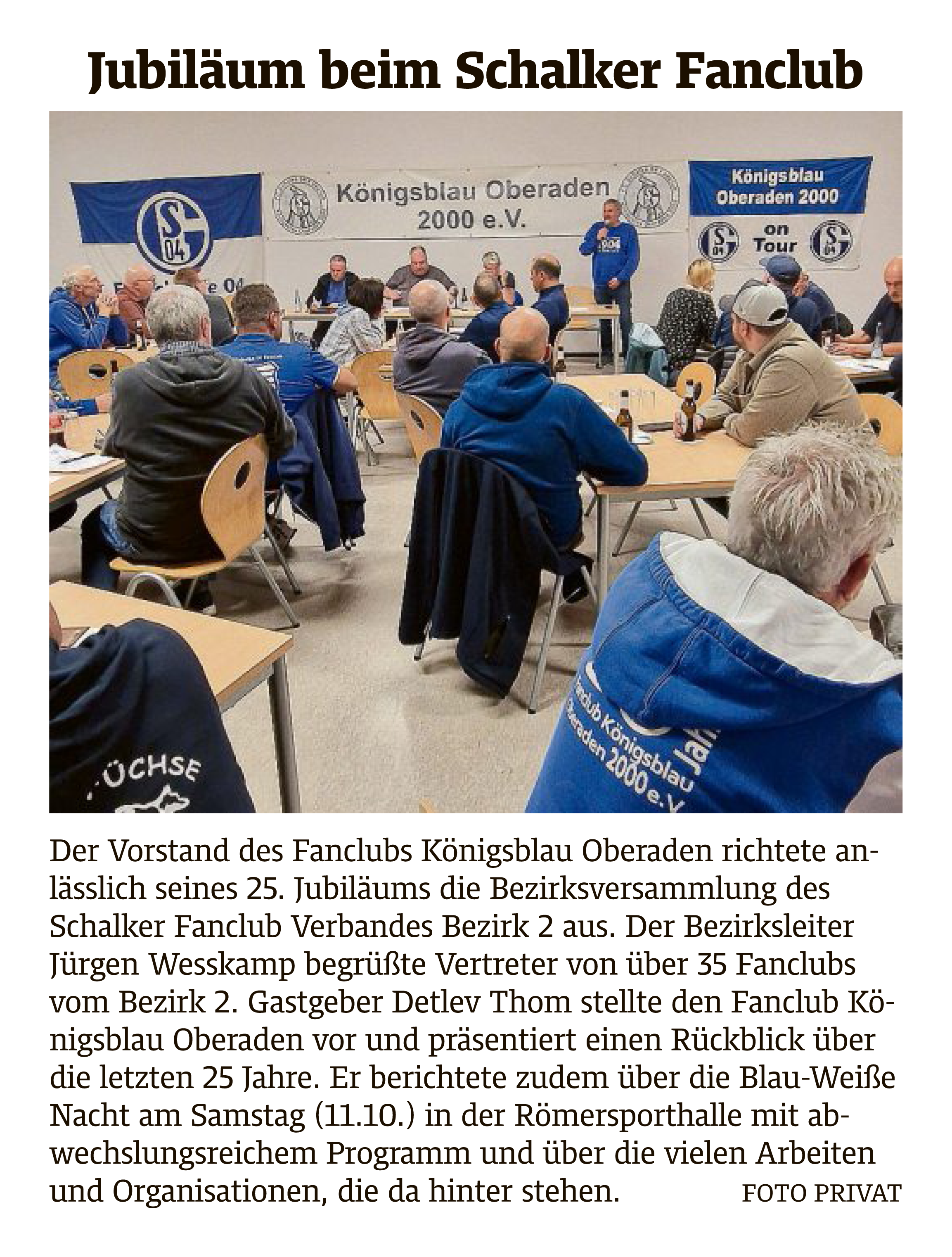 Der Fanclub "Königsblau Oberaden 2000 e.V." feiert in diesem Jahr sein 25-jähriges Bestehen. Aus diesem Anlass richten wir die Blau-Weiße Nacht des Bezirks 2 im Schalker Fan-Club Verband (S.F.C.V.) aus. Wir laden alle Schalker herzlich zu einem stimmungsvollen Abend voller Musik, Gemeinschaft und Emotionen ein.