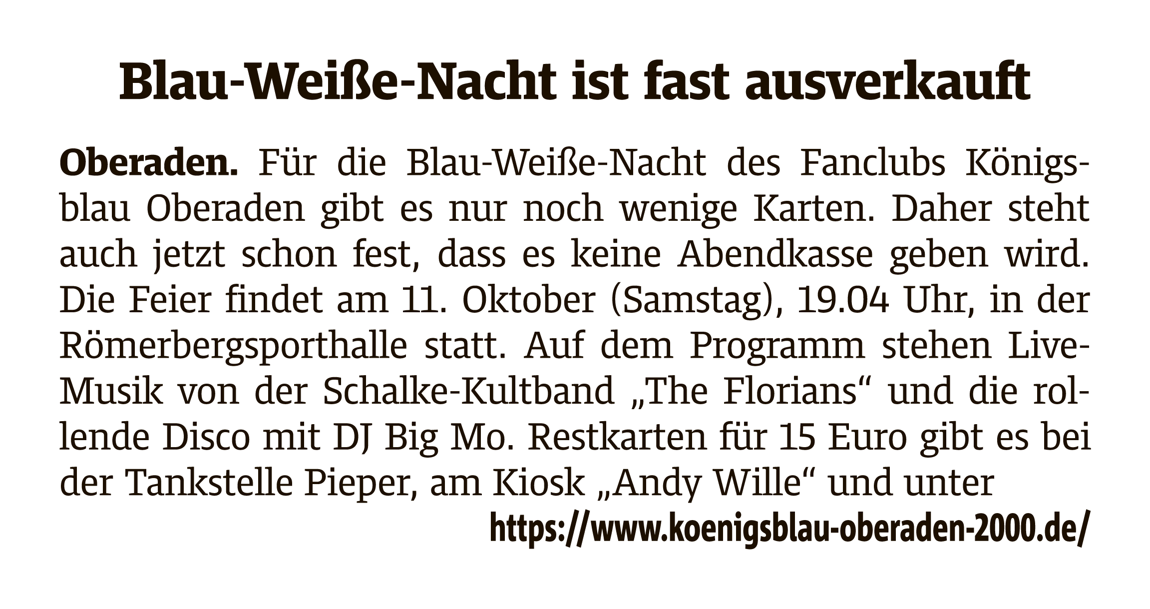 Der Fanclub "Königsblau Oberaden 2000 e.V." feiert in diesem Jahr sein 25-jähriges Bestehen. Aus diesem Anlass richten wir die Blau-Weiße Nacht des Bezirks 2 im Schalker Fan-Club Verband (S.F.C.V.) aus. Wir laden alle Schalker herzlich zu einem stimmungsvollen Abend voller Musik, Gemeinschaft und Emotionen ein.